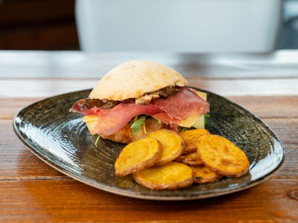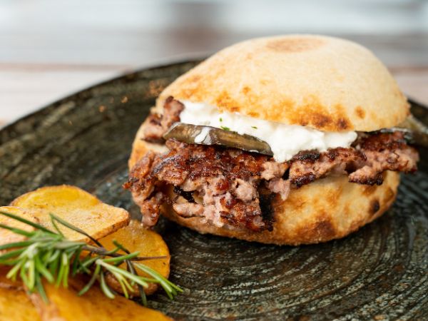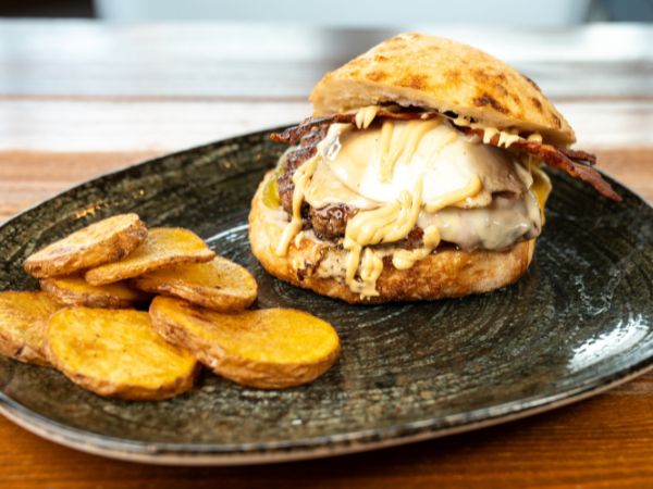 200gr of spiced smash beef, edam cheese, pickles, caramelized onions, egg, bacon and Pedavena Special sauce, served with Mediterranean potatoes.