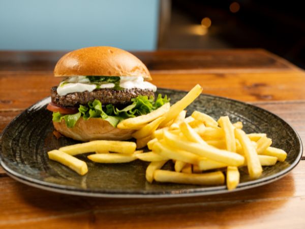 400gr di carne di manzo, insalata, pomodoro, cipolla rossa, stracciatella e crema al basilico. Servito con 200g di patatine fritte*.