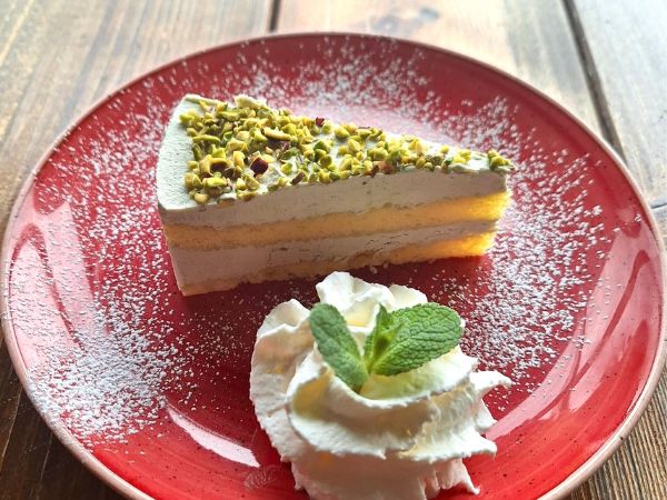 Soft layers of sponge cake alternated with pistachio semifreddo and cream, topped with crunchy pistachio crumble.