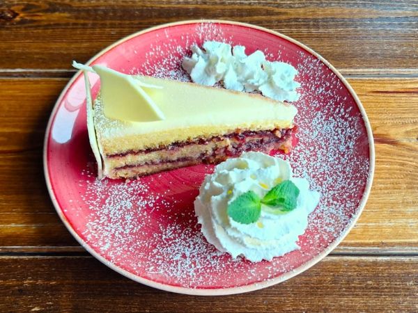 Soft sponge cake filled with red berry jam, covered with a delicate white chocolate icing.